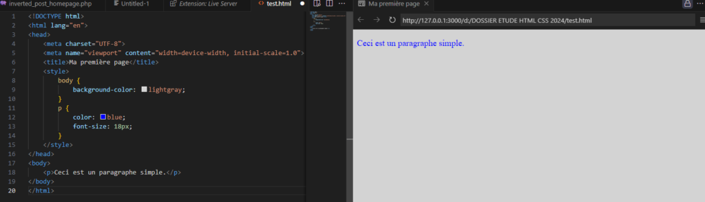 body { background-color: lightgray; }: Change la couleur de fond de la page en gris clair.p { color: blue; font-size: 18px; }: Rend le texte des paragraphes bleu avec une taille de 18 pixels.