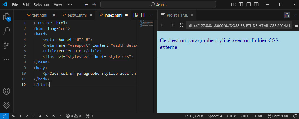 Méthode 1 : vous enregistrez le fichier (chapitre4.html), dans votre Finder ou votre Explorateur de fichier, vous double cliquez sur le ficher (chapitre4.html), le fichier s’ouvre dans le navigateur par défaut.