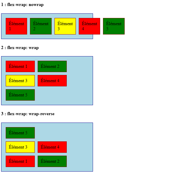 3. wrap-reverse : Comme wrap, mais les lignes sont inversées (la nouvelle ligne apparaît au-dessus de la précédente).
