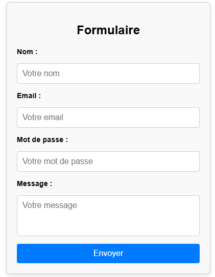 Ce code ne propose qu’un formulaire d’affichage. Il n’est pas fonctionnel, car il ne contient aucune logique côté serveur ou JavaScript pour traiter ou envoyer les données saisies. Il est uniquement destiné à illustrer la mise en forme visuelle d’un formulaire.