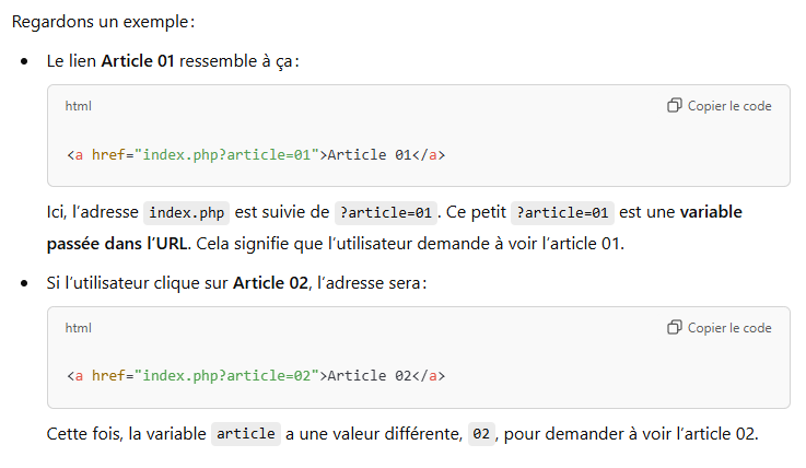 Lorsque vous ouvrez index.php, le programme commence par regarder s’il y a un numéro d’article dans l’adresse (URL), comme ?article=02. Si un numéro est présent, il essaie d’afficher l’article correspondant ; sinon, il choisit automatiquement d’afficher l’article 01.
