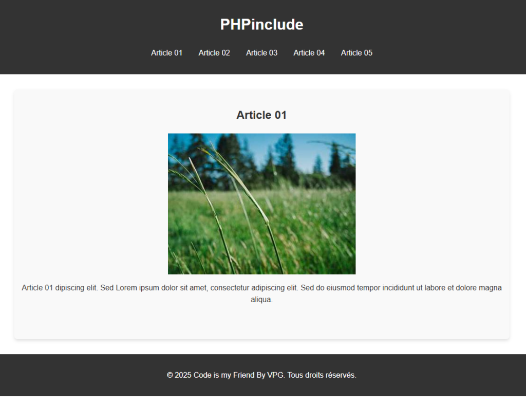 Le fichier _header.html affiche un menu simple contenant les liens vers les 5 articles. Chaque lien ajoute un paramètre ?article=XX à l’adresse pour indiquer quel article afficher.
