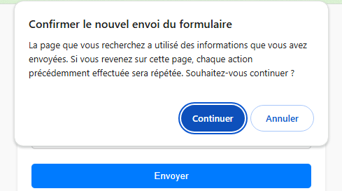 F5ouCtrl + F5), le navigateur tente de rejouer la dernière requête. Dans le cas d’une requêtePOST, cela signifie qu’il essaie de renvoyer les mêmes données au serveur. - Pour éviter des actions non voulues (comme soumettre un paiement deux fois), le navigateur affiche un message de confirmation : »Cette page demande à être resoumise. Cela peut entraîner une duplication des actions précédentes. »