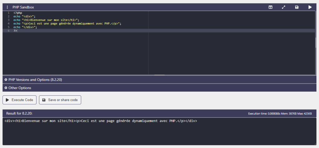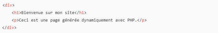Le résultat est une page contenant un titre et un paragraphe. Cela montre comment PHP peut être utilisé pour écrire du HTML de manière simple et directe.