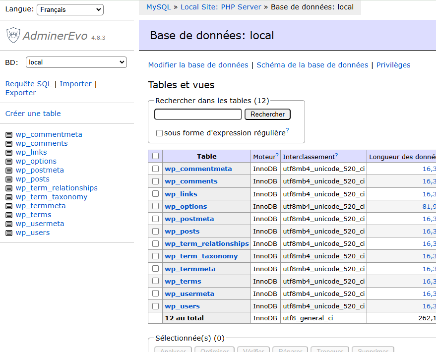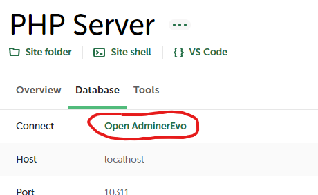 - Cela ouvre Adminer directement dans votre navigateur, déjà configuré pour se connecter à la base de données du site sélectionné.