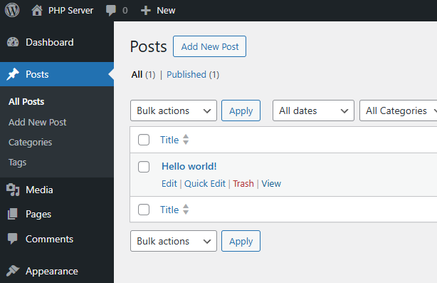 Aller dans « Posts » [GB] ou « Article » [FR] et vérifier que l’article de démo existe.