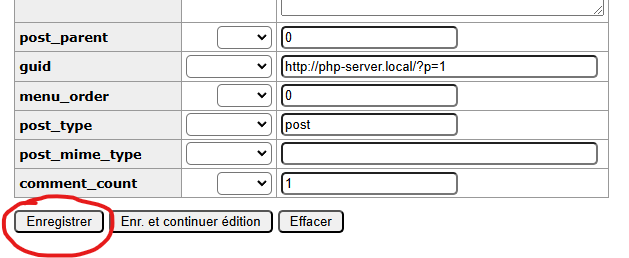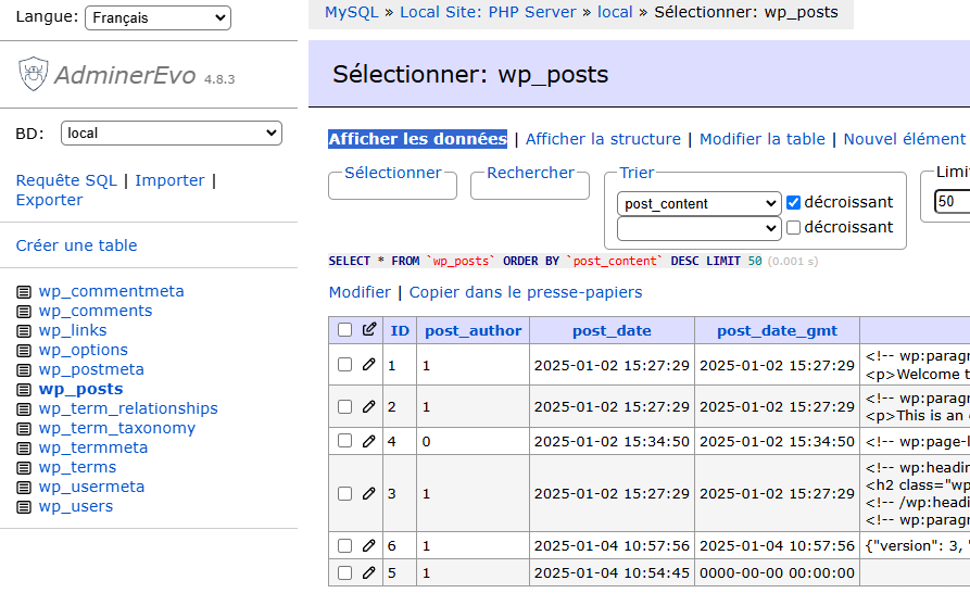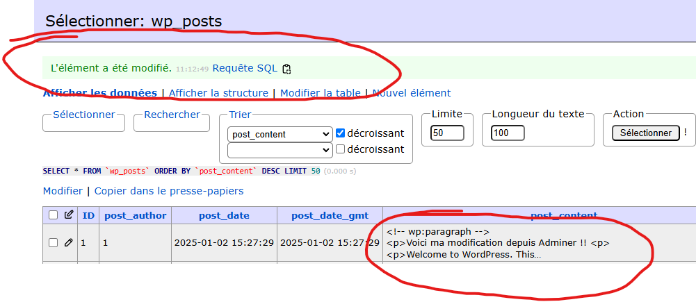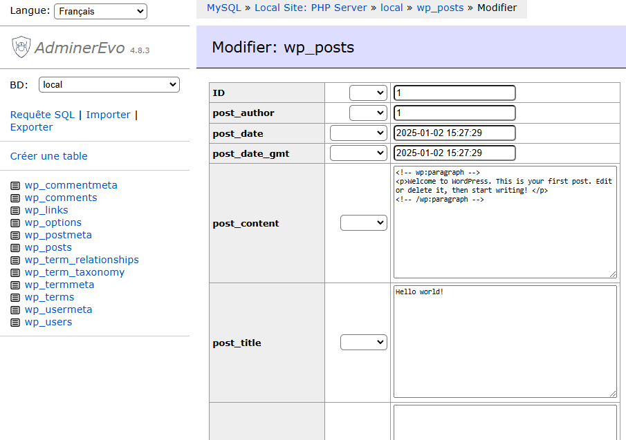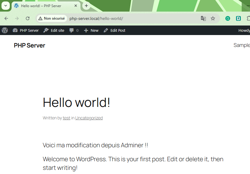 Cette procédure permet de modifier directement un article WordPress via Adminer tout en vérifiant les résultats sur le front-end (http://php-server.local/?p=1). Elle est idéale pour un dépannage rapide ou pour apprendre à manipuler les données WordPress directement dans la base.