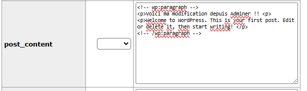 L’objectif de cette démarche est de modifier directement le contenu d’un article WordPress (ID = 1) en passant par Adminer, un outil d’administration de base de données, sans utiliser le back-office de WordPress. Cela permet de comprendre le fonctionnement interne de la base de données et de manipuler les données stockées pour des ajustements rapides ou des tests spécifiques.