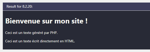 Ici, la ligne avec echo génère un titre <h1> via PHP, tandis que le paragraphe est directement en HTML.